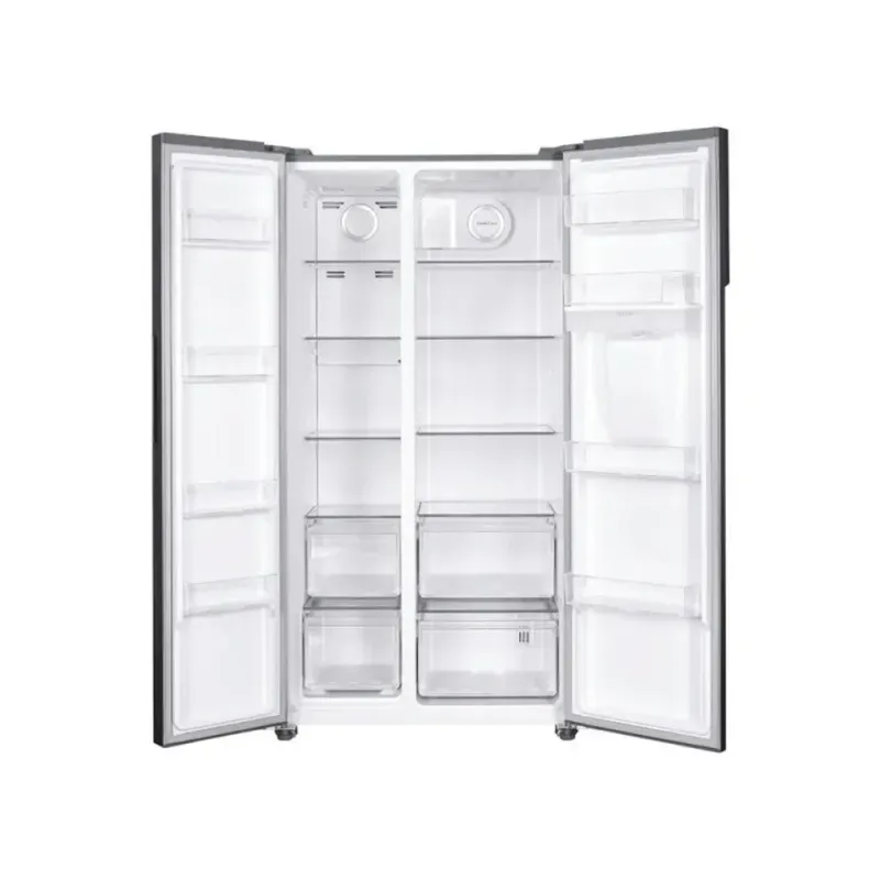 Su diseño side by side con puertas independientes permite acceder cómodamente a los compartimentos de refrigeración y freezer, optimizando el uso del espacio. La estética en acero inoxidable aporta un estilo contemporáneo y resistente, ideal para cocinas modernas.